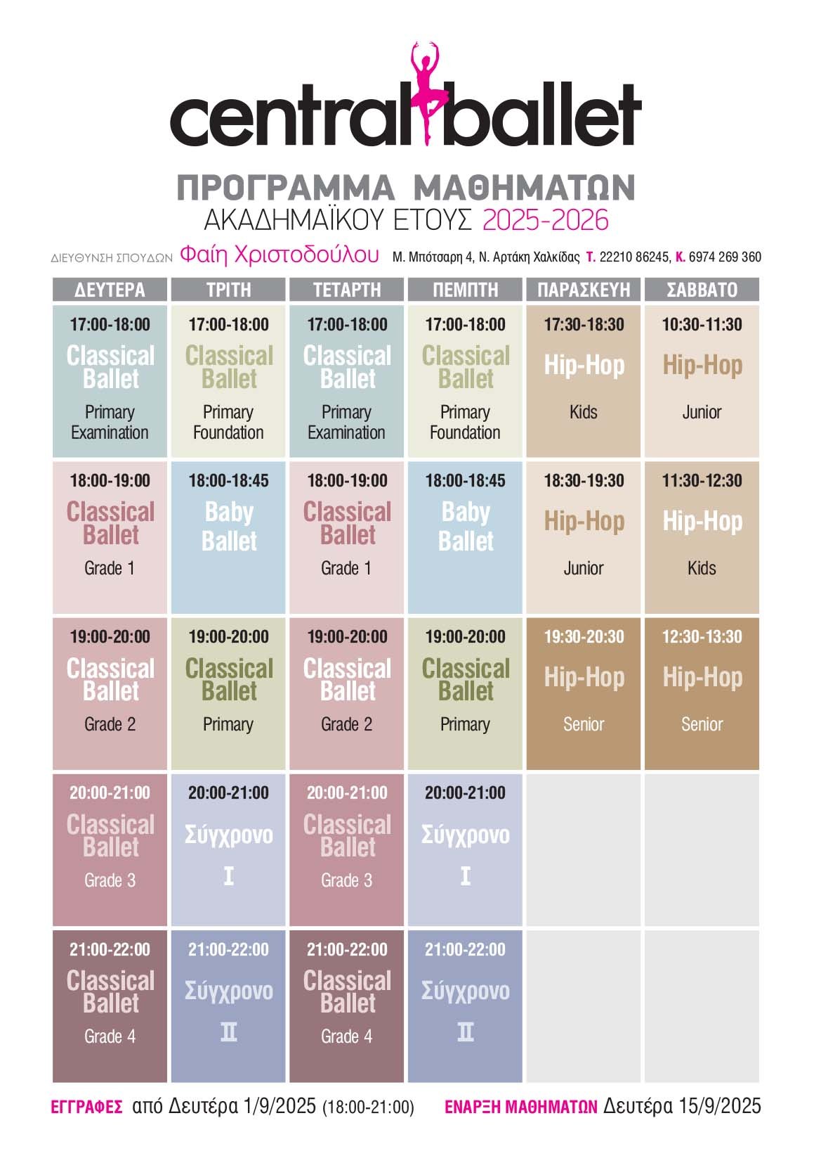 Το πρόγραμμα μαθημάτων της σχολής ενδέχεται να τροποποιηθεί ελαφρώς και συνιστούμε σε κάθε περίπτωση να το επιβεβαιώσετε με ένα τηλέφωνο στη γραμματεία μας.